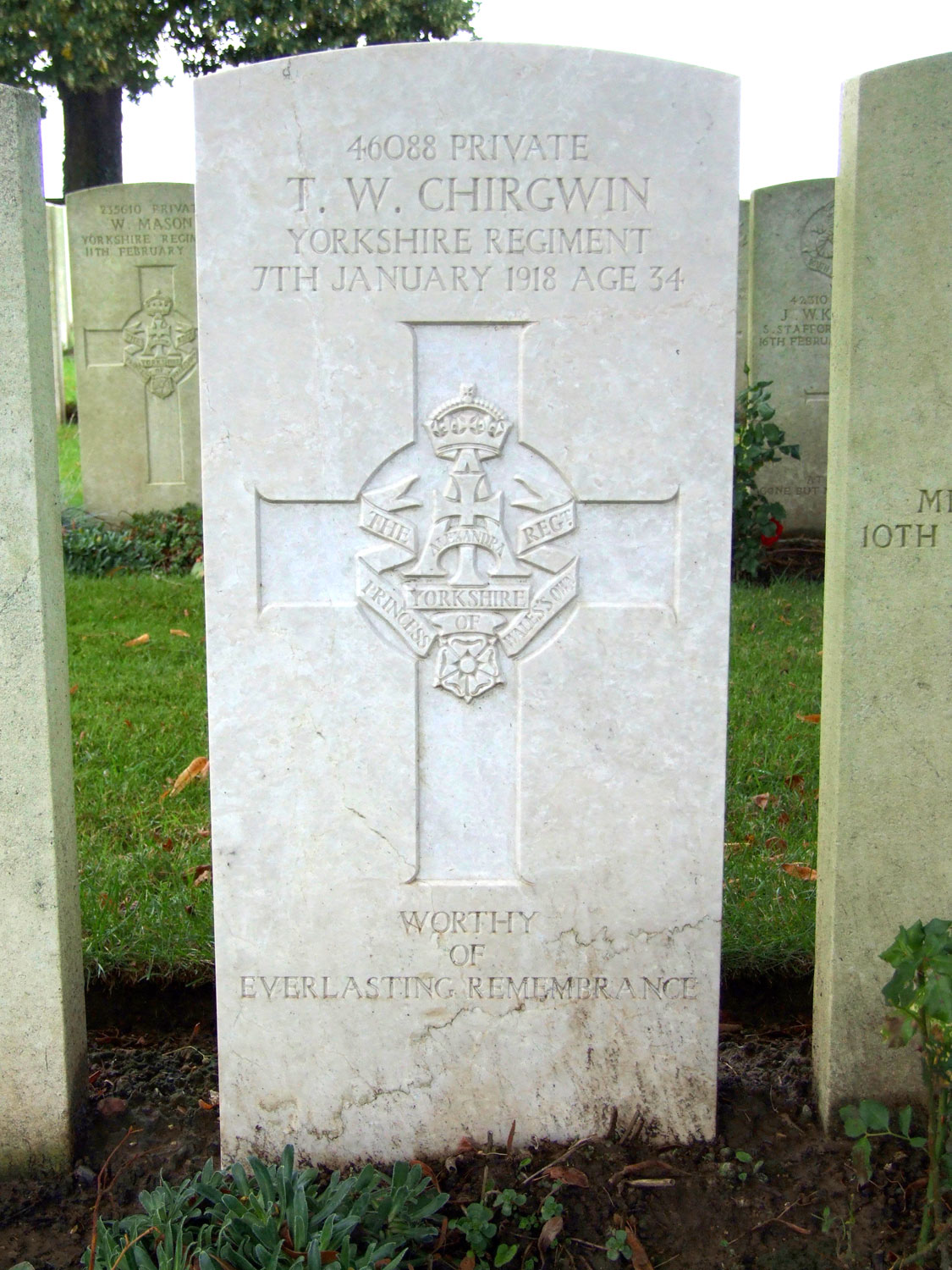 46088. 12th Battalion Yorkshire Regiment, formerly 187805 R E. Son of Charles and Elizabeth Warren Chirgwin, of Parr, Cornwall; husband of Mabel Irene Chirgwin, of Penzer House, Newlyn West, Penzance. Killed 7 January 1918. Aged 34. Born Paul (Cornwall), Enlisted Penzance, Resided Paul (Cornwall). "WORTHY