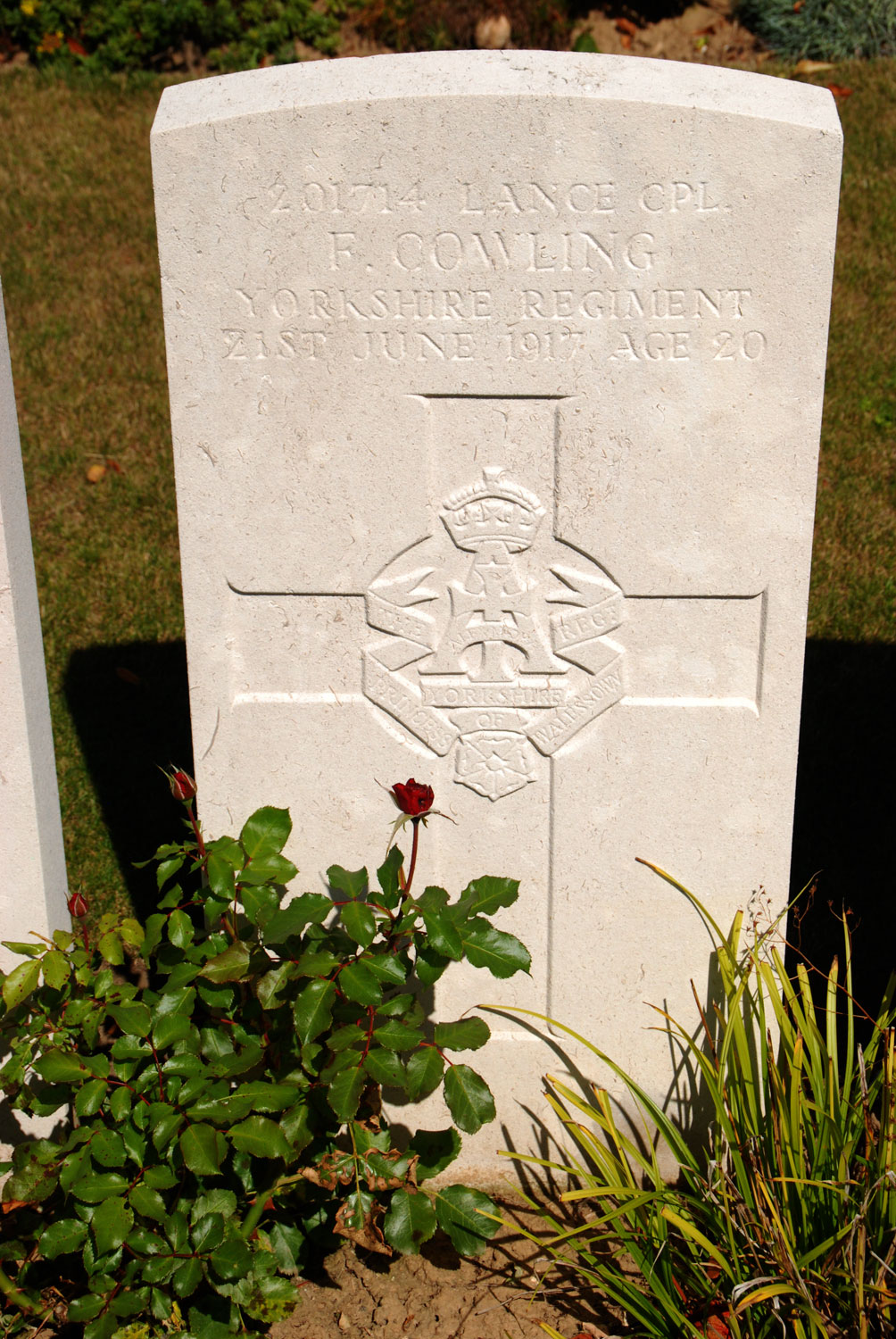 201714. 5th Battalion Yorkshire Regiment. Son of James and Frances Cowling, of South Parade, Northallerton, Yorks. Killed 21 June 1917. Aged 20. Enlisted Northallerton. Photo : Christopher Weekes, (<weebex12@hotmail.com>) |