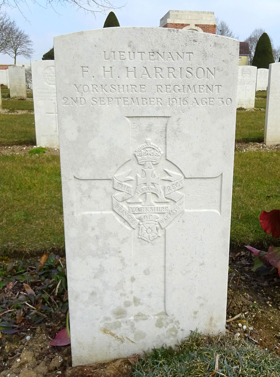 Lieutenant Francis Harold Harrison. 3rd Battalion the Yorkshire Regiment, attached 5th Bn. Special Bde. Royal Engineers. Son of Frank and Ruth Harrison, of 7, Guilford Place, London, W.C.1. Killed 2 September 1916. Aged 30. Photo by Len of the Find a Grave website. |