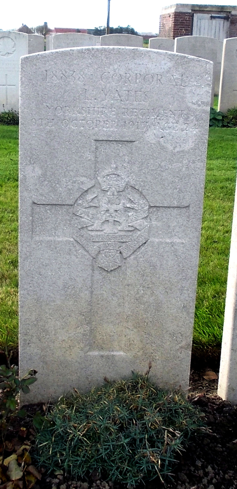 | Corporal Leonard Yates. 18838. 6th Battalion Yorkshire Regiment. Son of Samuel and Sarah Yates, of Wigan, England; husband of Lilian Williams (formerly Yates), of Duncans, British Columbia, Canada. Killed 9 October 1917. Aged 24. Born Sheffield, Enlisted Middlesbrough, Resided Wigan. Photo : Dave Elcoate (<drdavesongs@hotmail.co.uk>) |