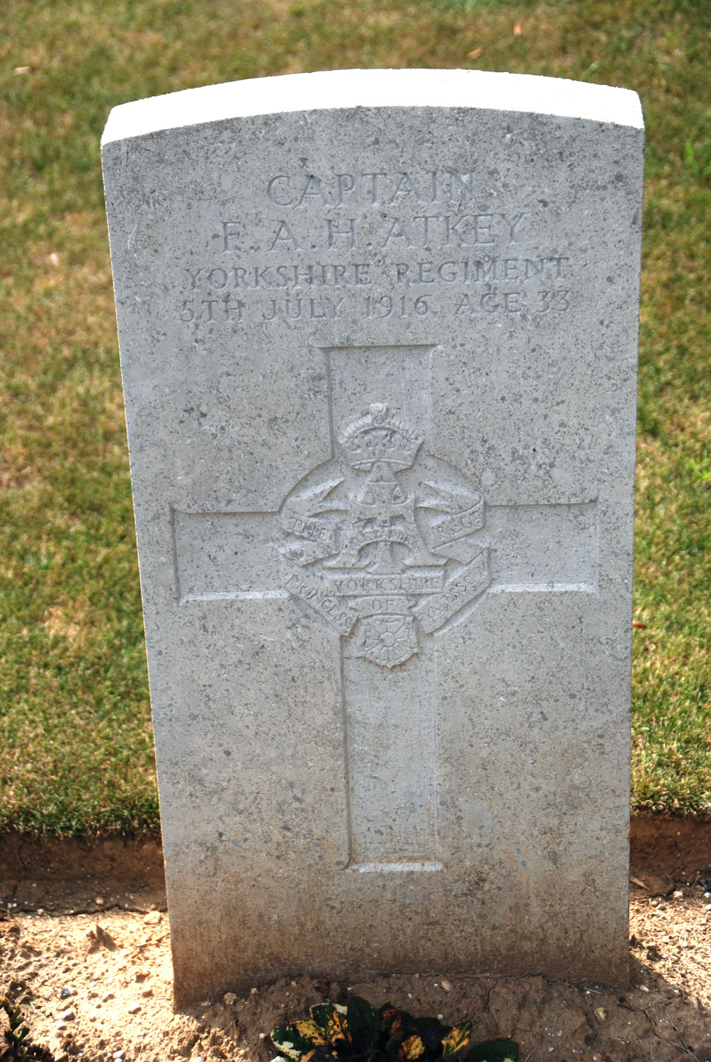 Atkey. 9th Battalion Yorkshire Regiment. Son of Frederick Walter and Ellen Louisa Atkey. Killed 5 July 1916. Aged 33. |