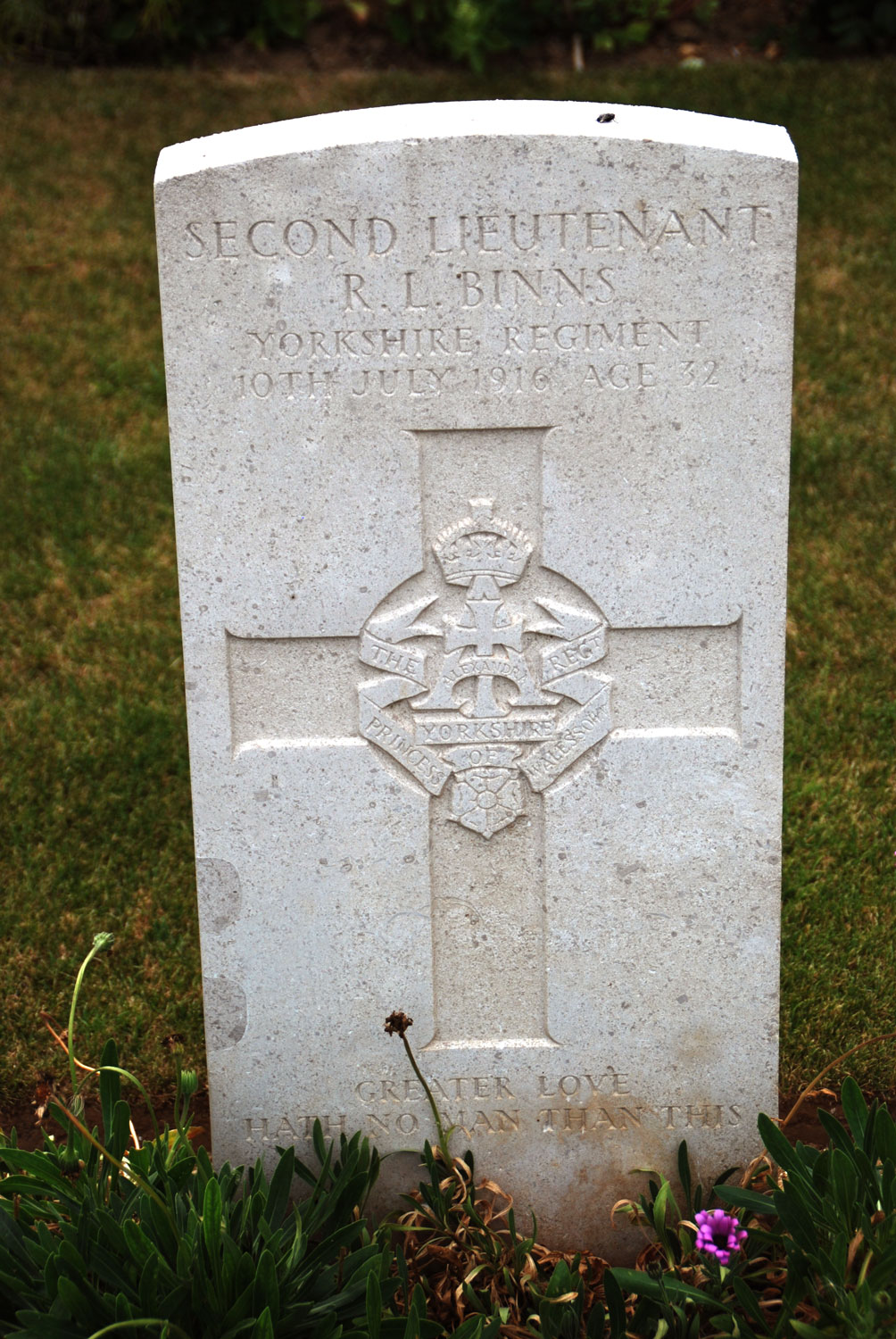 8th Battalion Yorkshire Regiment. Son of Dr. William Binns and Mrs. Binns, of The Cedars, East Bergholt, Suffolk. Educated Stonyhurst College, Lancs. Married 1913 Maud only daughter of the late Rev. J. and Mrs. Cartman, of Bonby Vicarage, Hull. Killed 10 July 1916. Aged 32. "GREATER LOVE