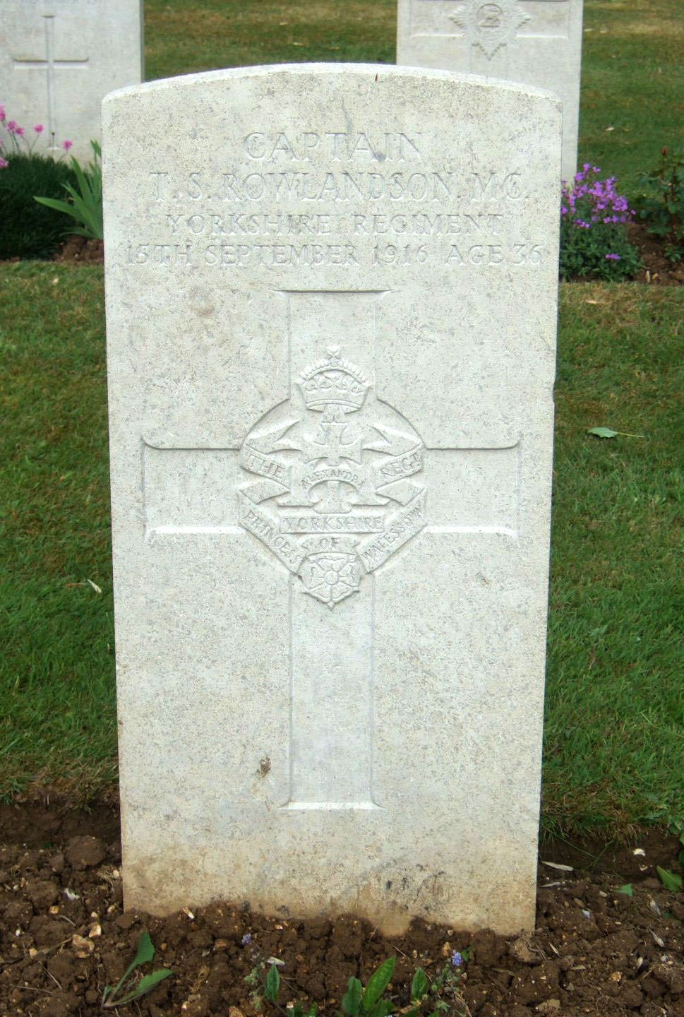 MC. 4th Battalion Yorkshire Regiment. Son of Samuel and Isabel Rowlandson, of Newton Morrell, Darlington. Killed 15 September 1916. Aged 36. (Thomas Sowerby Rowlandson was born in Newton Morrell in June 1880. He was Baptised at Holy Trinity, Darlington on 21 June 1880. In the 1881 Census his father ran a 1030 acre farm, employing 20 men and 3 boys. 5 domestics were employed in the house. Bob Coulson stated that he was at Cambridge University, entering Trinity Hall in 1901. He also played football as a goalkeeper with Newcastle United in the 1905/6 season and had spells with Sunderland and the Corinthian Casuals. On the Newcastle United fan's website there are further details of Thomas Rowlandson's football playing career.) |