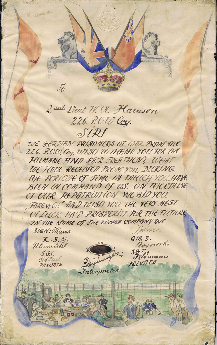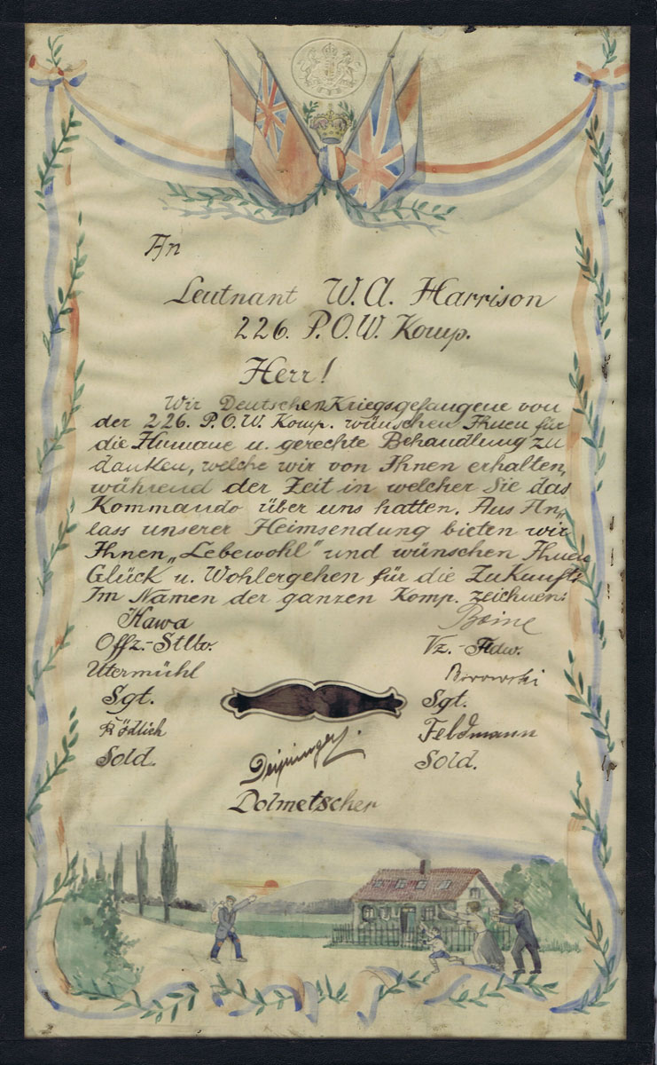 To express their thanks at their fair treatment German POWs wrote two illustrated thank-you letters to Harrison. There are two versions of the document, in German and in English, each written and painted on a piece of British War Office paper. The English version reads, ‘To 2nd Lieut W.A. Harrison 226 P.O.W. Coy. Sir! We German prisoners of war from the 226 P.O.W. Coy wish to thank you for the humane and fair treatment what we have received from you, during the period of time, in which you have been in command of us. On the cause of our repatriation we bid you ‘farewell’ and wish you the very best of luck and prosperity for the future in the name of the whole company.’ It is signed by the Regimental Sergeant Major, the Quartermaster Sergeant, two Sergeants and two privates.