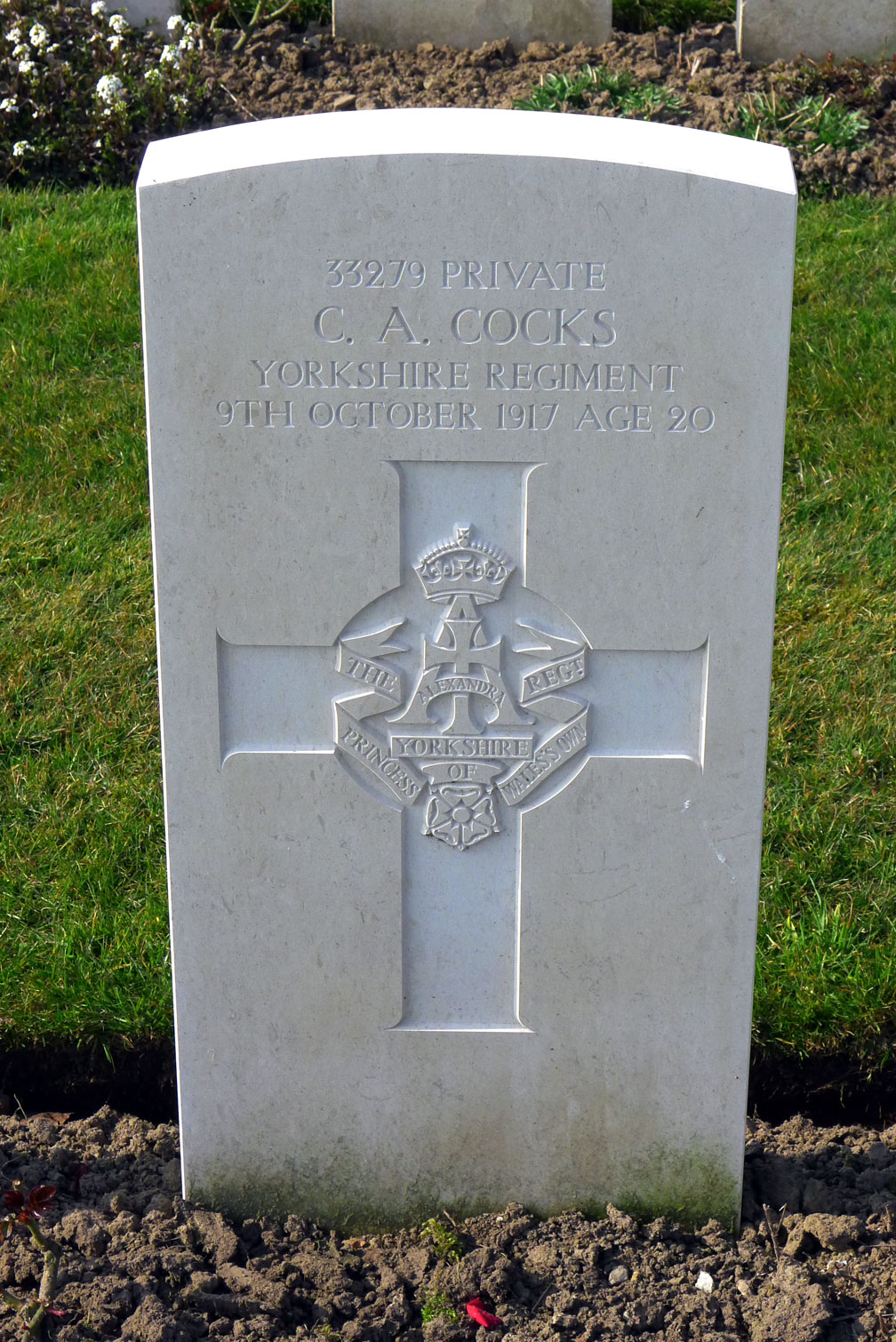 33279. 6th Battalion the Yorkshire Regiment. Son of Augustus and Jane Cocks, of Upper Helmsley, York. Killed 9 October 1917. Aged 20. Born Rousham (Oxford), Enlisted Gate Helmsley, Resided Upper Helmsley (Yorks). |