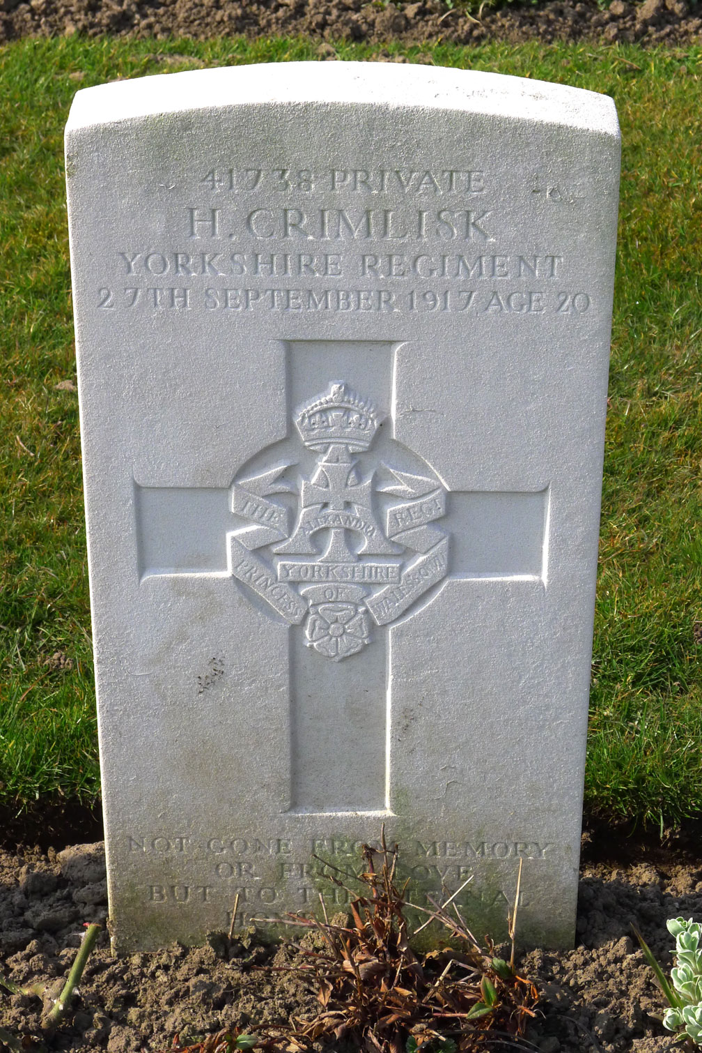 6th Battalion the Yorkshire Regiment,formerly 174516 R F A. Son of Thomas and Margaret Crimlisk, of 21, Victoria Avenue, Filey, Yorks. Killed 27 September 1917. Aged 20. Born Filey, Enlisted Beverley (Yorks), Resided Filey. (Name spelt "Crimlish" in SDGW and GH Gazette database) "NOT GONE FROM MEMORY