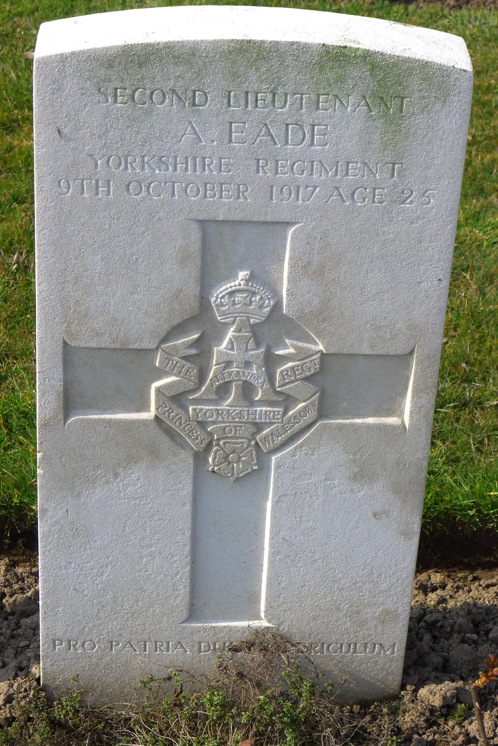 3rd Battalion the Yorkshire Regiment, attached to 2nd Battalion. Son of the Rev. Charles John Aylmer Eade and Constance Eade, of Aycliffe Vicarage, Darlington. Killed 9 October 1917. Aged 25.