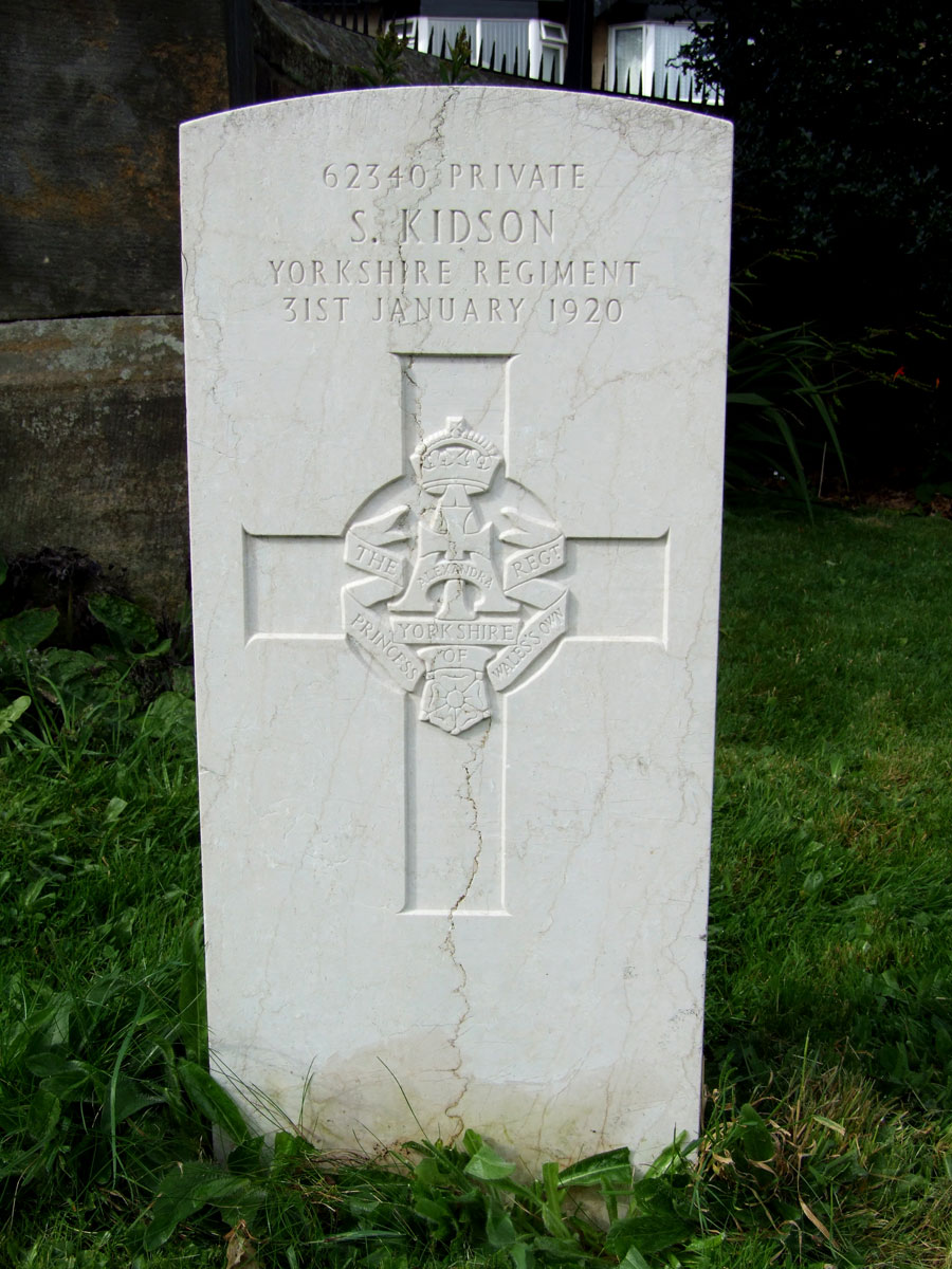 62340. 2nd Battalion the Yorkshire Regiment. Died at home 31 January 1920. Aged 36. Enlisted York, Resided Harrogate Private Kidson's Service record exists, as does his Pension record (Kidson). He enlisted on 20 July 1918 and served 9 months at home, before then serving 6 months in Ireland. He was demobilised on 10 November 1919. |