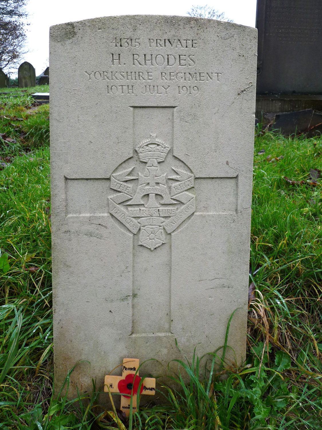| Private Harry Rhodes. 41315. 17th Battalion the Yorkshire Regiment. Son of Charles & Betty H Rhodes of Smithy Bridge, Littleborough. Died 10 July 1919. Aged 21. Born Wardle (Lancs), Enlisted Bury (Lancs). . (Private Rhodes' Pension Record exists. Enlisted 1March 1916. Discharged 10 September 1917 due to severe mental deficiency.) |
