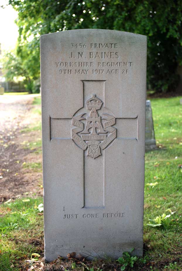 | Private Joseph Nichols Baines, 3456. 4th Battalion Yorkshire Regiment. Son of John William and Mary Jane Baines, of Mount Pleasant, Great Ayton. Died at home 9 May 1917. Aged 21. | ||