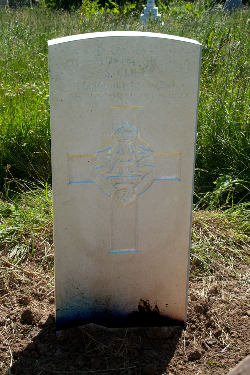 When visited in June 2011, the plot where two of the Yorkshire Regiment graves are located was in very poor condition, - completely overgrown and many graves broken and hidden. However, the cemetery has subsequently been tidied-up and some of the toppled headstones restored. (Ref : Hazel Hickman (<hickman379@btinternet.com>).