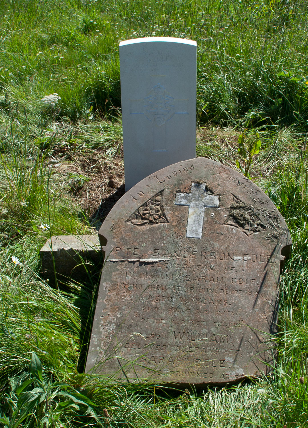 | Private Sanderson Cole. 23945. 14th Battalion Yorkshire Regiment. Son of Mrs. Sarah Cole, of Church St., Staithes, Yorks. Died at home 27 December 1915. Aged 22. Born Staithes, Enlisted Middlesbrough, Resided North Ormesby. The inscription on the Cole family headstone reads;- "Pte Sanderson Cole, beloved son of William & Sarah Cole, who died at Ripon Dec 27 1915 aged 22 years. Died doing his duty. Peace Perfect Peace. Also William, beloved husband of Sarah Cole, who was drowned at sea....." To view larger sized images of the headstones (left), click on the thumbnail. Close the window that opens to return to this page. Photos : Edward Nicholl |