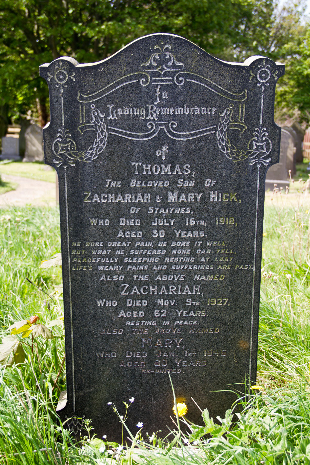 | Sapper Thomas Hick. 96998. Royal Engineers, formerly 17890 the Yorkshire Regiment. Son of Zachariah and Mary Hick, of Melville House, High St., Staithes, Yorks. Died at home 16 July 1918. Aged 30. Born Staithes (Yorks), Enlisted Whitby (Yorks). "IN LOVING REMEMBRANCE / OF / THOMAS, THE BELOVED SON OF ZACHARIAH & MARY HICK / OF STAITHES WHO DIED JULY 16TH 1918 AGED 30 YEARS HE BORE GREAT PAIN, HE BORE IT WELL, BUT WHAT HE SUFFERED NONE CAN TELL. PEACEFULLY SLEEPING RESTING AT LAST LIFE'S WEARY PAINS AND SUFFERINGS ARE PAST ALSO THE ABOVE NAMED / ZACHARIAH WHO DIED NOV 9TH 1927 / AGED 62 YEARS RESTING IN PEACE ALSO THE ABOVE NAMED / MARY WHO DIED JAN 1ST 1946 AGED 80 YEARS. RE-UNITED" The Hick family headstone is almost immediately behind the headstone for Private Dunn. Select either of the thumbnail images on the left to open a larger sized image in a new window. Photos : Edward Nicholl |