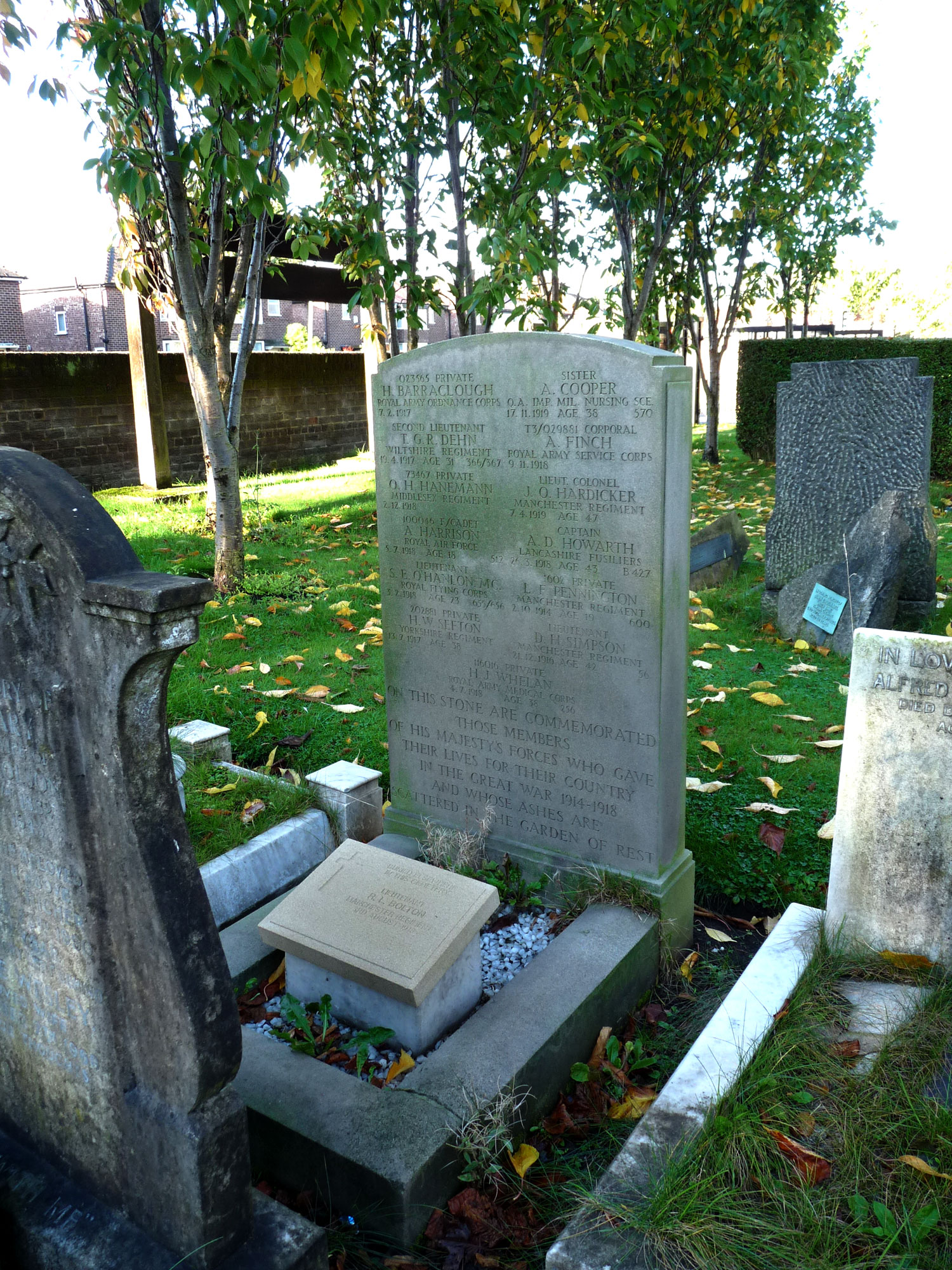 The 14 casualties of the 1914-1918 War cremated here are commemorated on a memorial stone near the entrance to the grounds. The 177 casualties of the 1939-1945 War are commemorated on the memorial screen wall which stands in the 1939-1945 War Graves Plot, in nearby Manchester (Southern) Cemetery.