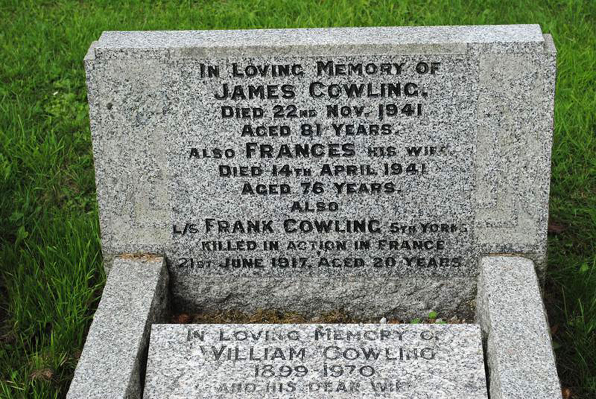 JAMES COWLING / DIED 22ND NOV 1941 / AGED 81 YEARS ALSO FRANCES HIS WIFE DIED 14TH APRIL 1941 / AGED 76 YEARS ALSO L/C FRANK COWLING 5TH YORKS KILLED IN ACTION IN FRANCE 21 JUNE 1917 AGED 20 YEARS. IN LOVING MEMORY OF WILLIAM COWLING / 1899 - 1970 AND HIS DEAR WIFE MABEL / 1898 (?) - 1976" |