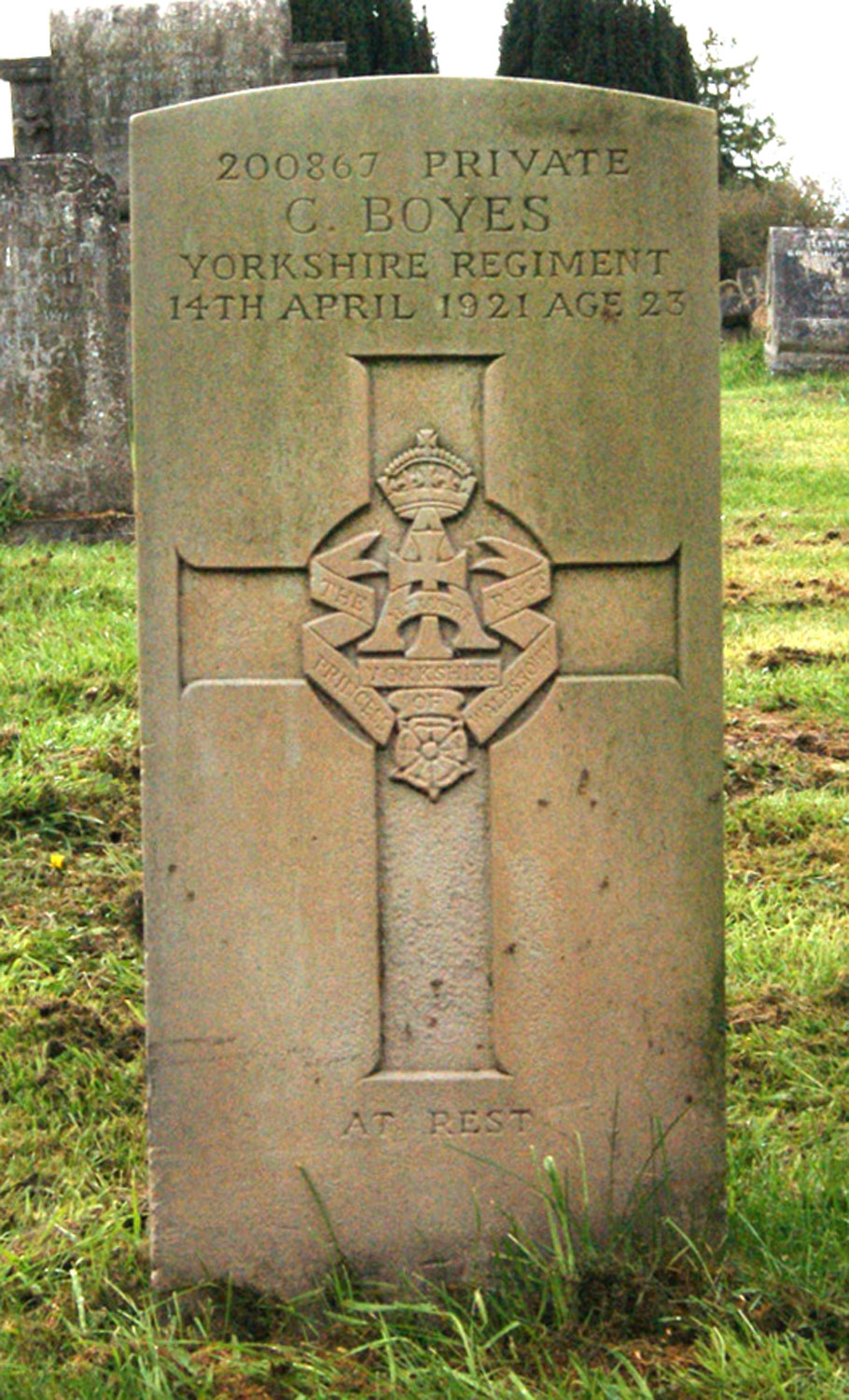 | Private C Boyes. 200867. 4th Battalion the Yorkshire Regiment. Son of Robert Boyes, of 2, Malpas Place, Northallerton. Died at home 14 April 1921. Aged 23. (Not listed in SDGW) "AT REST" |