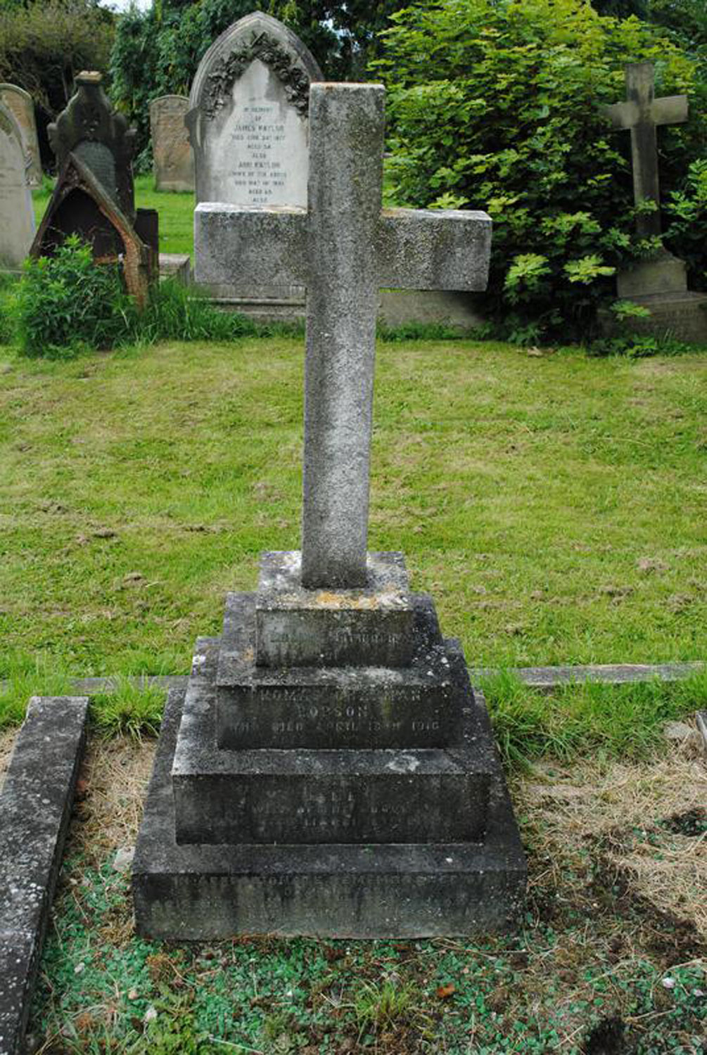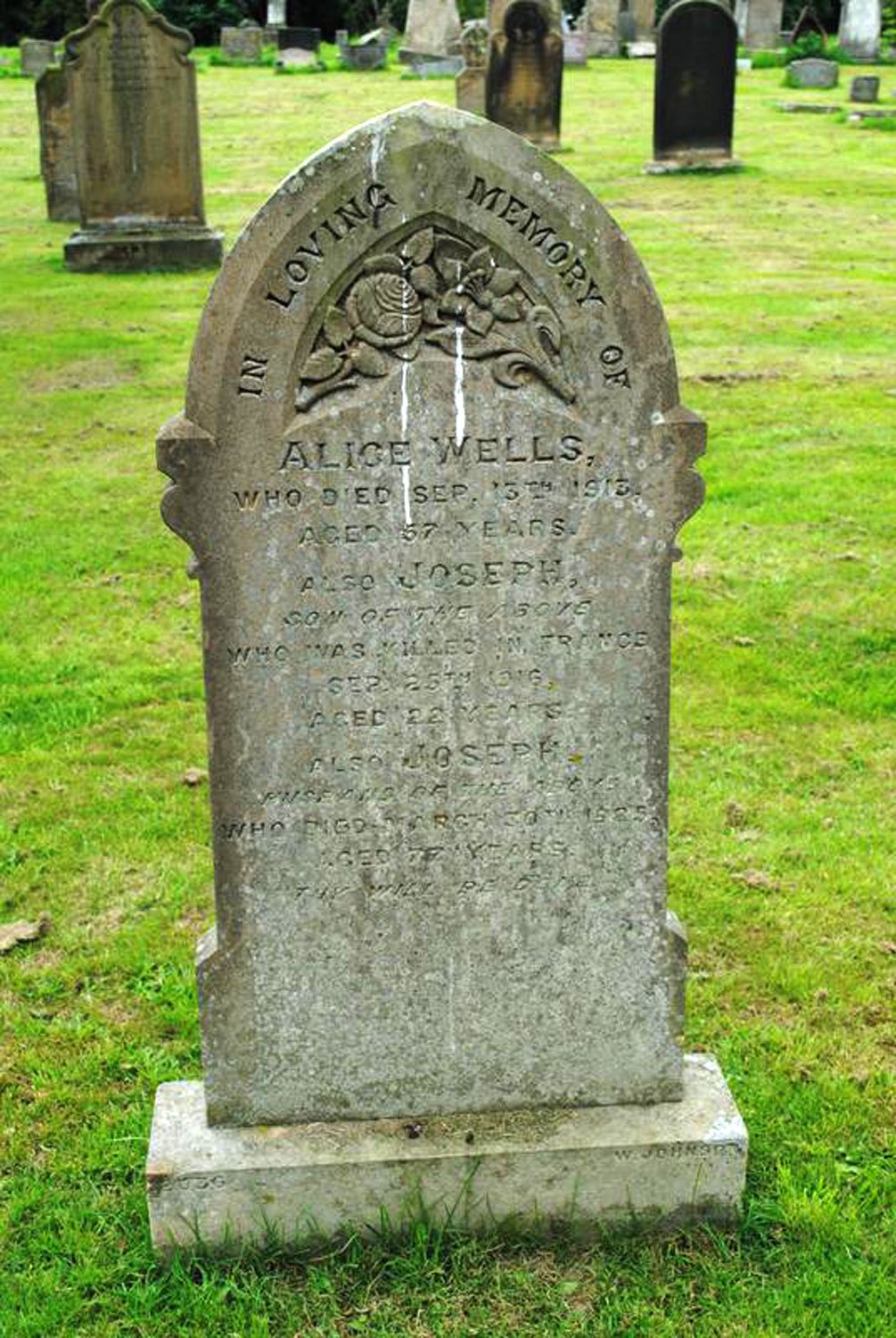| Private Joseph Wells. 34805. 10th Battalion King's Own Yorkshire Light Infantry, formerly 3977 the Yorkshire Regiment. Son of Joseph and Alice Wells, of Romanby, Northallerton, Yorks. Killed 25 September 1916. Agged 22. Enlisted Northallerton. Commemorated Pier and Face 11 C and 12 A, THIEPVAL MEMORIAL. "IN LOVING MEMORY / OF ALICE WELLS / WHO DIED SEPT. 13TH 1913 / AGED 57 YEARS ALSO JOSEPH SON OF THE ABOVE WHO WAS KILLED IN FRANCE SEPT. 25TH 1916 / AGED 22 YEARS ALSO JOSEPH / HUSBAND OF THE ABOVE WHO DIED MARCH 30TH 1925 / AGED 78 YEARS THY WILL BE DONE" |