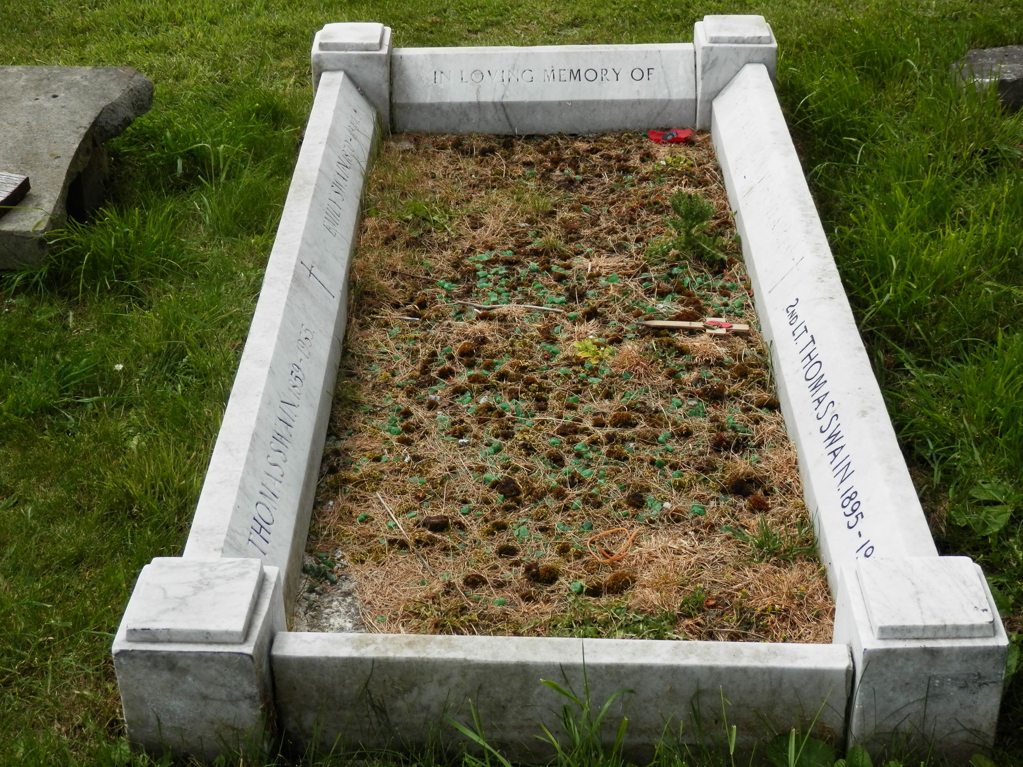 2nd Lt William SWAIN - In France, 1894 - 1916. 2nd Lt Thomas SWAIN 1895 - 1916. Thomas SWAIN 1859 - 1935. Emily SWAIN 1870 - 1944." Both Swain brothers served in the Yorkshire Regiment, and both are commemorated on the Northallerton War Memorial. The names of two Swain brothers are inscribed on the kerb opposite their parents, William's names is faded. Photo : Dimitrios Corcodilos of the Find a Grave website |