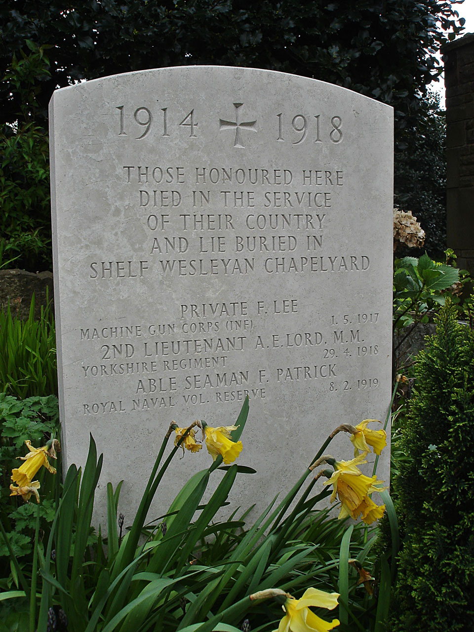 Shelf (Bethel) Methodist Chapelyard contains 4 burials from the First World War and 1 burial from the Second World War. There is also a Special Memorial to three Servicemen from the First World War who are buried in the Shelf Wesleyan Chapelyard.