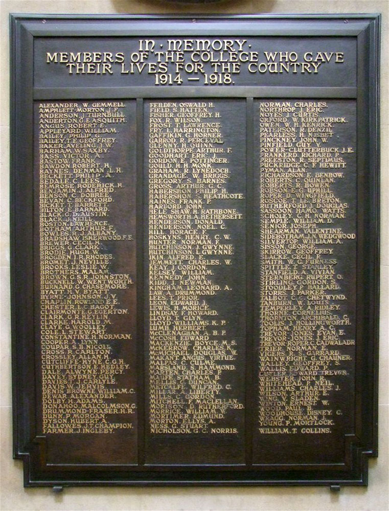 The First World War Memorial in the Chapel for Clare College, Cambridge
