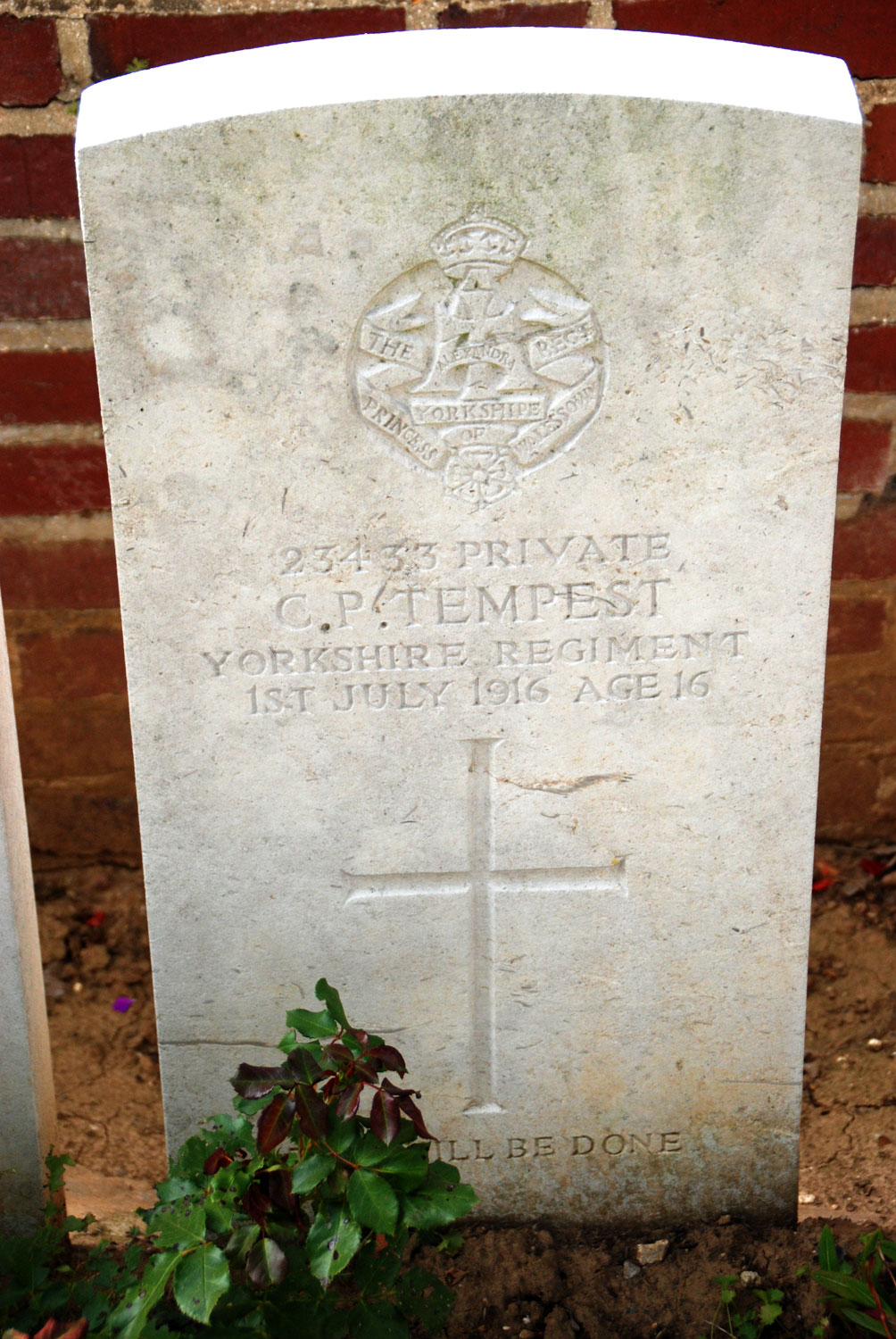 23433. 2nd Battalion Yorkshire Regiment. Son of Thomas and Emily A. Tempest, of 17, Mill Lane, Richmond, Yorks. Vernon Street Cem. Killed 1 July 1916. Aged 16. Born Richmond (Yorks), Enlisted Richmond. "THY WILL BE DONE"