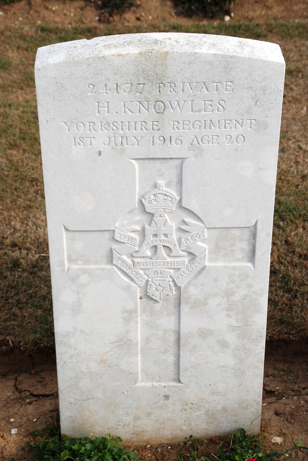 2nd Battalion Yorkshire Regiment. Son of George and Ellen Knowles, of Pateley Bridge, Yorks. Died 1 July 1916. Aged 20. Born Pately Bridge (Yorks), Enlisted Tanfield Lodge, Resided Pately Bridge. |