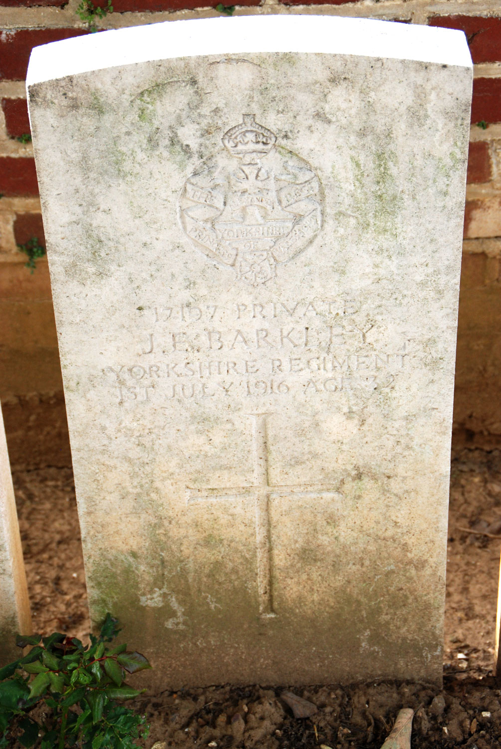 Private James Ernest Barkley, 17197. 2nd Battalion the Yorkshire Regiment. Son of George and Annie Mary Barkley, of Scarborough. Vernon Street Cem. Killed 1 July 1916. Aged 32. Born Sheffield, Enlisted Scarborough. Vernon Street Cemetery, - see photo of special memorial at foot of page |