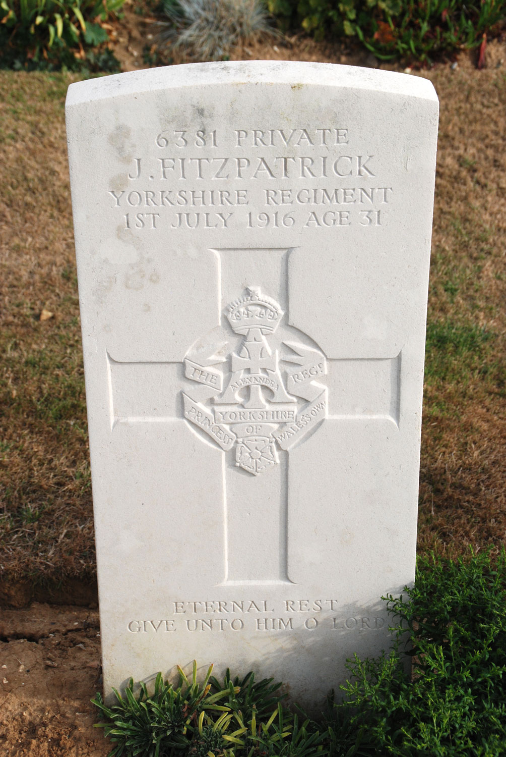 | Private James Fitzpatrick. 3/6381. 2nd Battalion Yorkshire Regiment. Son of James and Catherine Fitzpatrick. Killed 1 July 1916. Aged 31. Born Grangetown (Yorks), Enlisted Strensall, Resided Middlesbrough. "ETERNAL REST