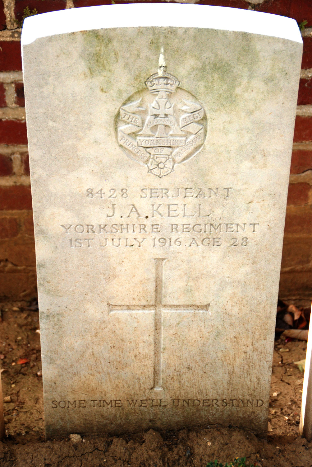 2nd Battalion Yorkshire Regiment. Husband of Jane Ann Kell, of 26, Commercial St., Scarborough. Native of Scarborough. Vernon Street Cem. Killed 1 July 1916. Aged 28. Born Scarborough, Enlisted Scarborough. "SOME TIME WE'LL UNDERSTAND"