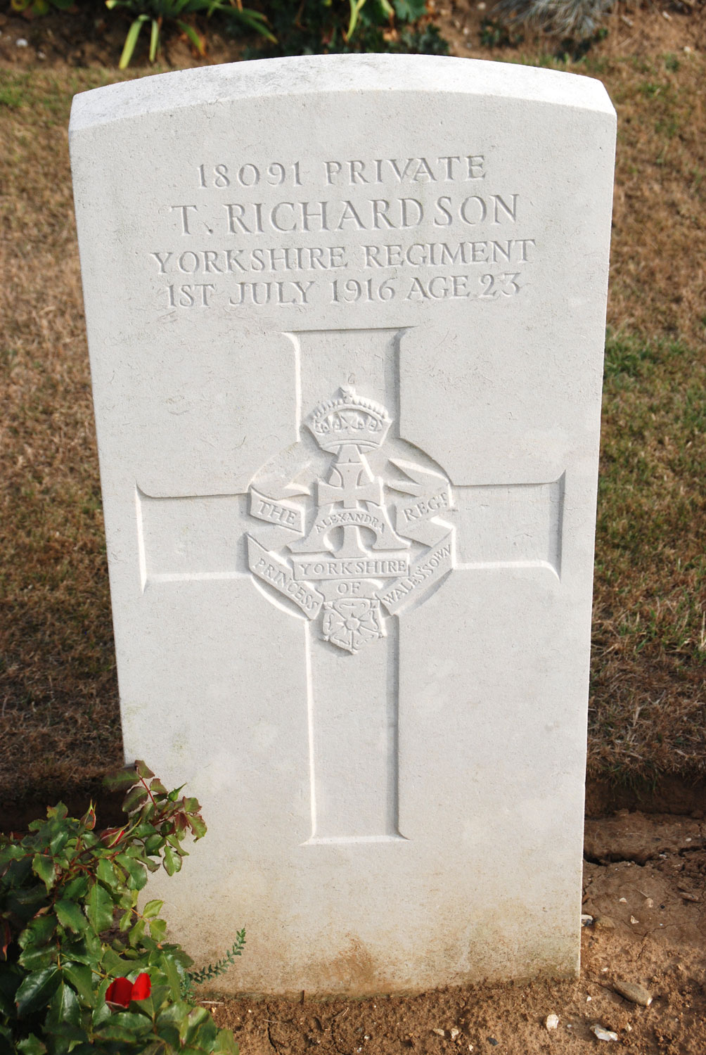 2nd Battalion Yorkshire Regiment. Son of George and Hannah Richardson (nee Robson), of Murton, Co. Durham; husband of Hannah Anderson (formerly Richardson), of 18 Back, South Railway St., Seaham Harbour, Durham. Died 1 July 1916. Aged 23. Born Shotton Colliery (Durham), Enlisted Sunderland, Resided Murton Colliery. |