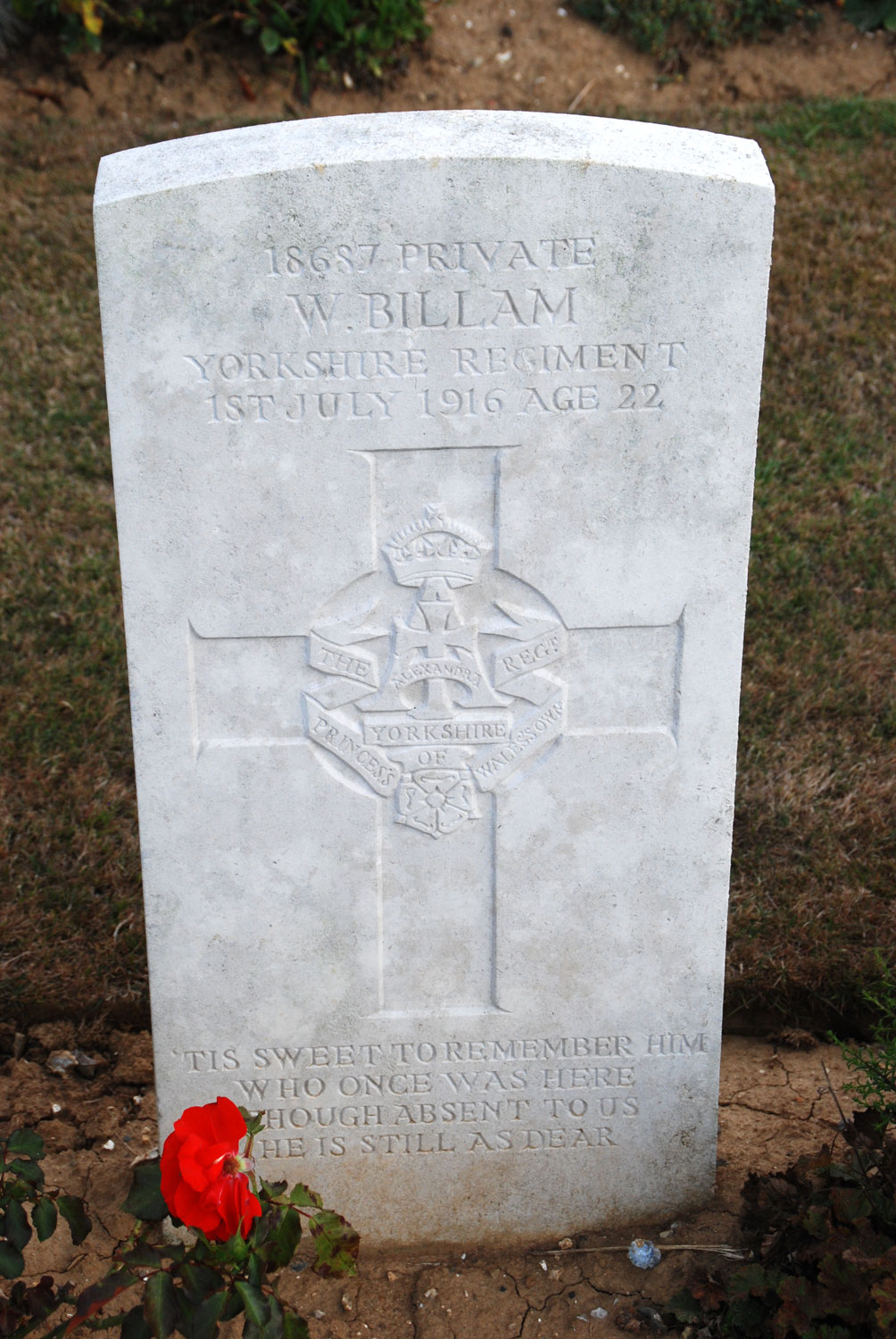 2nd Battalion the Yorkshire Regiment. Son of Mrs. Elizabeth Billam, of Hinderwell; husband of Ada Elizabeth Billam, of Hinderwell, Yorks. Killed 1 July 1916. Aged 22. Born Hinderwell, Enlisted Whitby, Resided Hinderwell. "TIS SWEET TO REMEMBER HIM