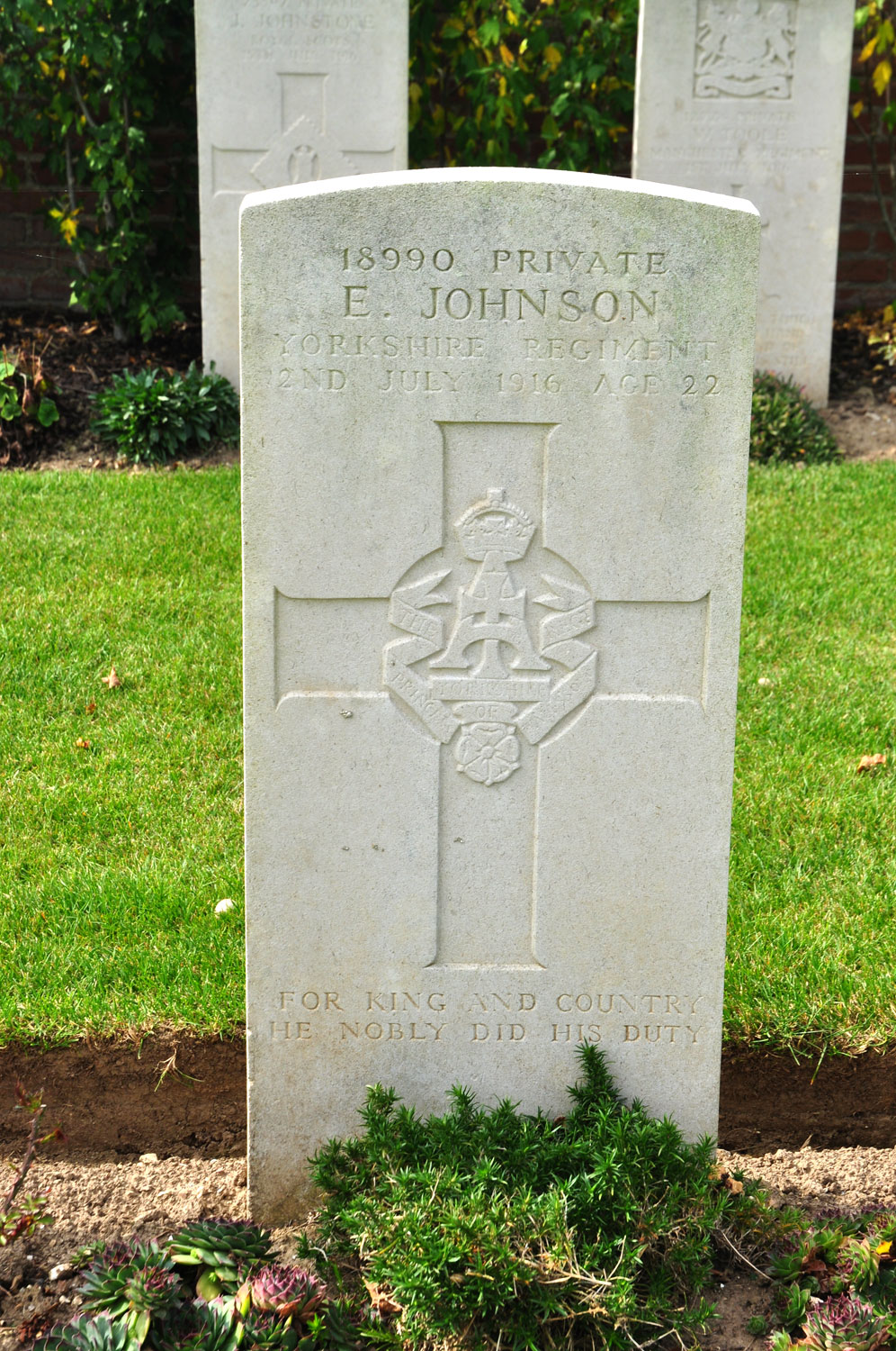 18990. 2nd Battalion the Yorkshire Regiment. Son of Alfred and Mary Johnson. Killed 2 July 1916. Aged 22. Born Sleights (Yorks), Enlisted Whitby, Resided Sleights (Yorks). "FOR KING AND COUNTRY