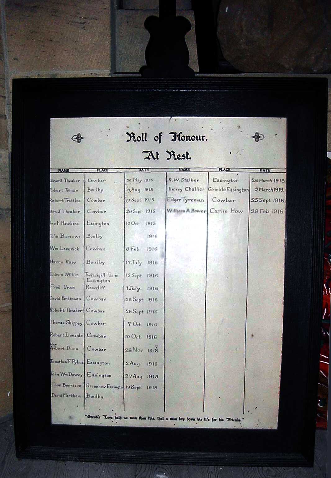 Easington, North Yorkshire, has a War Memorial outside the Church of All Saints, and there is also a Roll of Honour inside the church. The names of the men, and the information on them, as recorded on these two memorials is as below;-