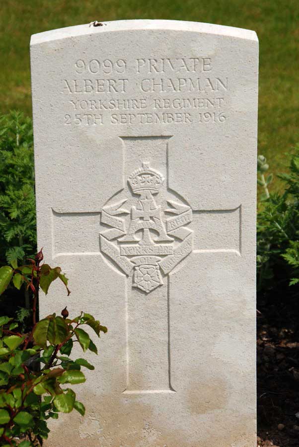 | Private Albert Chapman, 3/9099. 9th Battalion Yorkshire Regiment. Son of Thomas and Emma Chapman, of Old Malton, Yorks. Died of Wounds 25 September 1916. Born Old Malton (Yorks), Enlisted Malton, Resided Old Malton |