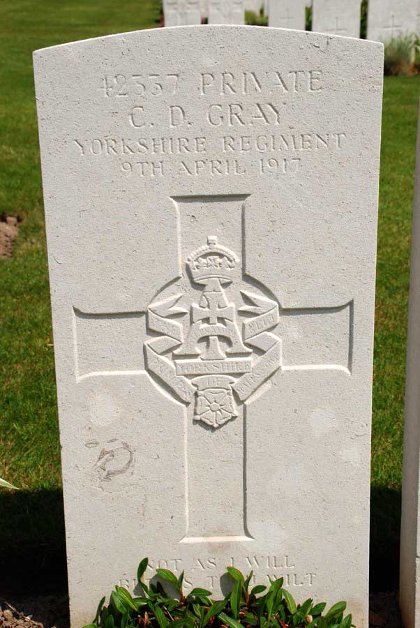 5th Battalion the Yorkshire Regiment. Son of Lucy and the late David Gray, of Bridlington, Yorks. Died of Wounds 11 March 1917. Aged 21. Born Bridlington, Enlisted Bridlington. |