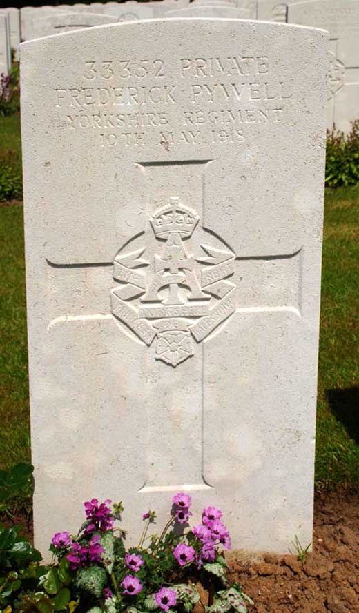 | Private Frederick Pywell. 33352. 4th Battalion Yorkshire Regiment, formerly 4216 Suffolk Regt. Son of John and Martha Pywell, of Buckden, Huntingdon; husband of Florence E. Pywell, of Norton, Bury St. Edmunds, Suffolk. Died of wounds 10 May 1918. Aged 36. Born Buckton (Hunts), Enlisted Ipswich, Resided Birstall. (SDGW gives Regimental No as 33552). |