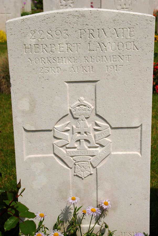 | Private Herbert Laycock. 22893. 10th Battalion Yorkshire Regiment. Husband of Rose Minnie Laycock, of 23, Wainfleet Avenue, Cottingham, Yorks. Native of Castleford, Yorks. Died of wounds 23 April 1917. Aged 25. Born Castleford, Enlisted Castleford, Resided Glass Houghton (Castleford) |