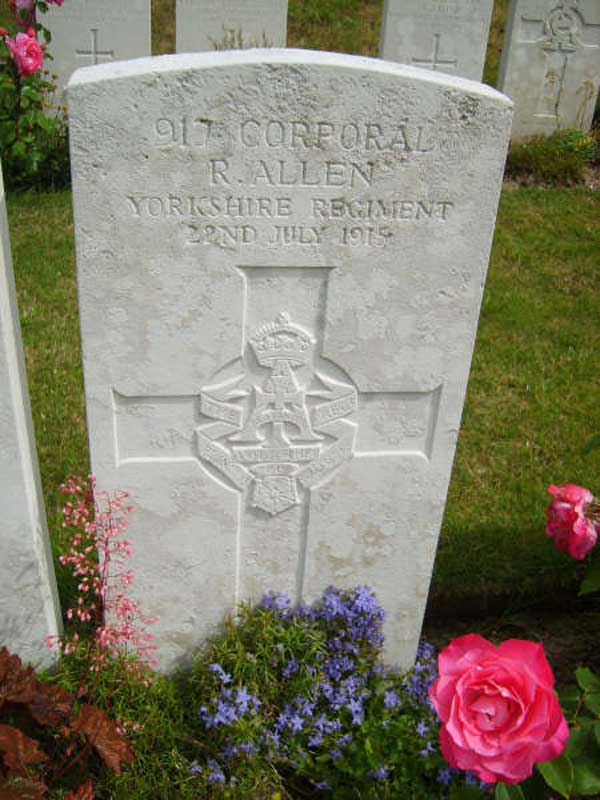 | Corporal Richard Allen, 917. 4th Battalion Yorkshire Regiment. Died of wounds 22 July 1915. Enlisted Guisborough. |