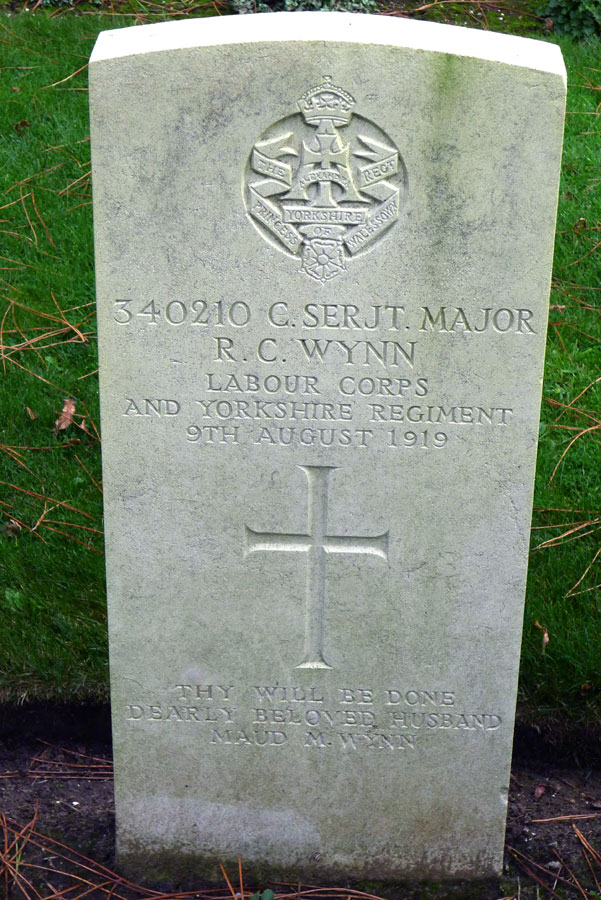 | Serjeant R C Wynn. 20955. 12th Battalion Yorkshire Regiment, transferred to Labour Corps (CSM 340210, 17th Coy). Son of Samuel and Elizabeth Wynn; husband of Maud Mary Wynn, of 24, Pease St., Eastbourne, Darlington. Native of Walton, Liverpool. Died 9 August 1919. Aged 27. (No record in SDGW) |