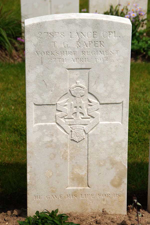 27878. 7th Battalion Yorkshire Regiment. Son of Jane A. and the late Thomas Raper, of Northallerton, Yorks. Died of wounds 27 April 1917. Aged 19. Born Leeming Bar (Yorks), Enlisted Northallerton, Resided East Harlsey. |