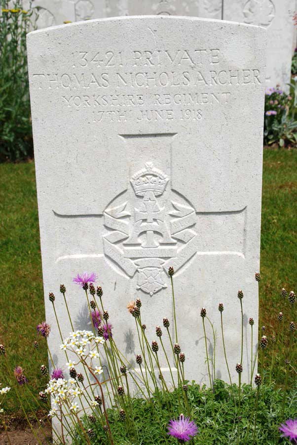 12th Battalion Yorkshire Regiment. Son of John Jones Archer and Harriet Ann Archer, of 10, Young St., Haverton Hill, Durham. Native of Middlesbro', Yorks. Died 17 June 1918. Aged 38. Born Middlesbrough, Enlisted Middlesbrough. |