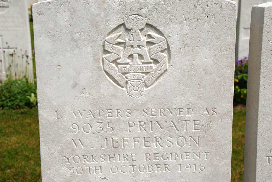 | Private Leonard Russell Waters, 3/9035. 9th Battalion Yorkshire Regiment. Son of Mrs. Annie Wilson, of 2, Derby St., Stockton-on-Tees. Born WILLIAM JEFFERSON. Husband of A. Waters, of 27, Milbank St., Middlesbrough, Yorks. Of Whitby, Yorks. Served in the South African War. Died of wounds on 30 October 1916. Aged 43. Born Whitby (Yorks), Enlisted Stockton, Resided Middlesbrough. Real name, Private William Jefferson, 3/9035. 9th Battalion the Yorkshire Regiment. Details as above. |