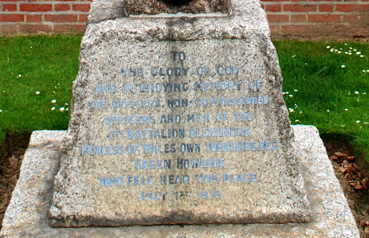 "TO THE GLORY OF GOD AND IN UNDYING MEMORY OF THE OFFICERS, NON-COMMISSIONED OFFICERS AND MEN OF THE 7TH BATTALION ALEXANDRA PRINCESS OF WALES' OWN YORKSHIRE REGIMENT GREEN HOWARDS WHO FELL NEAR THIS PLACE 1st JULY 1916."