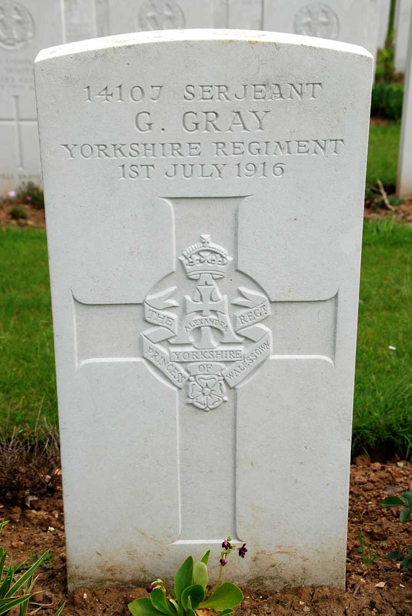 1 July 1916. Born South Shields, Enlisted Jarrow, Resided South Shields. (CWGC register has him down as "Serjeant G Gray") |