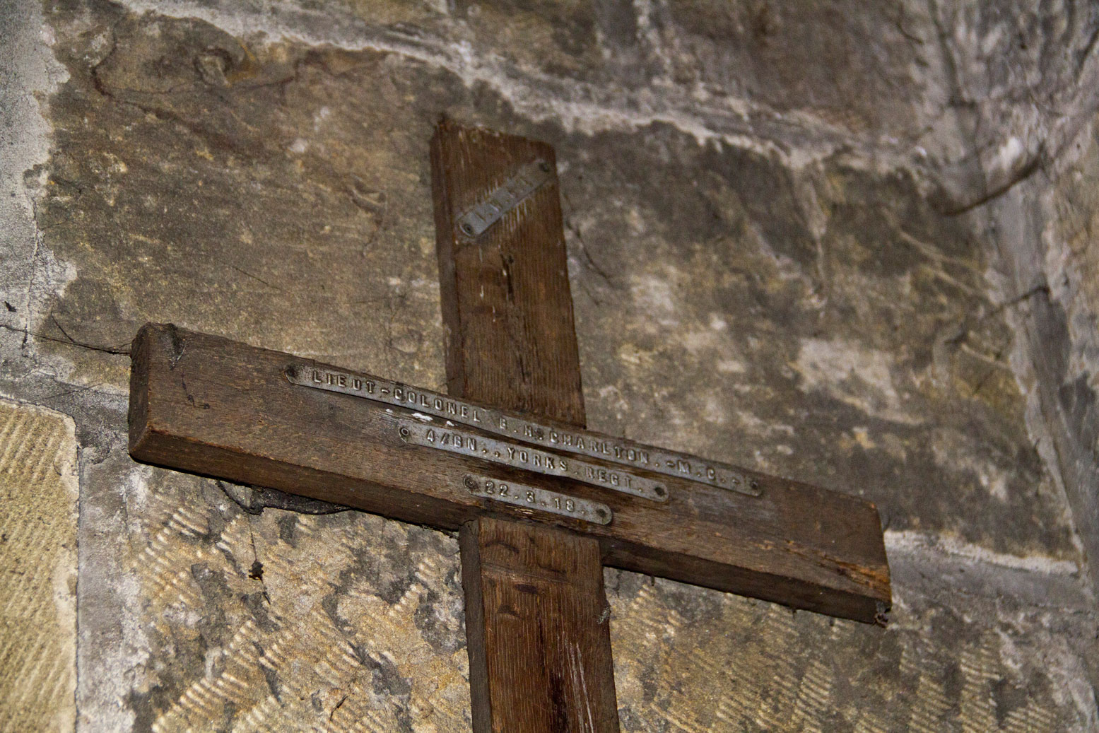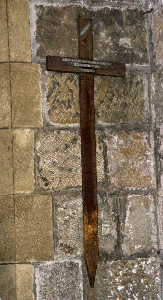 This Battle Cross is mounted on a wall in the North West corner of the church, close to the main entrance. What is rather remarkable is that an almost identical Battle Cross was originally displayed in the Parish Church at Tow Law, but was subsequently presented to the Green Howards Museum.
