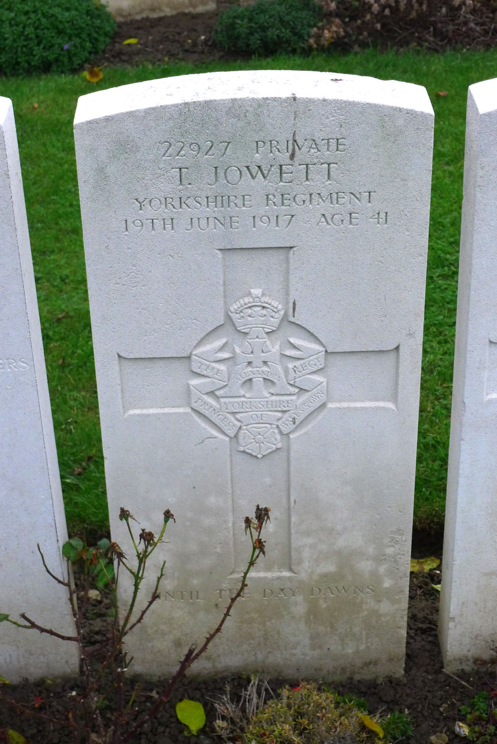| Private Thomas Jowett. 22927. 8th Battalion the Yorkshire Regiment. Son of Eli and Phoebe Jowett; husband of Mary Eliza Jowett, of I0, Smalewell Rd., Pudsey, Yorks. Killed 19 June 1917. Aged 41. Born Bradford, Enlisted Leeds, Resided Pudsey. "UNTIL THE DAY DAWNS"