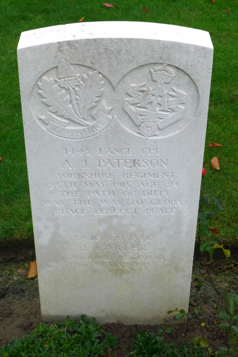 1442. 4th Battalion Yorkshire Regiment. Son of Archibald and Elizabeth Paterson, of 106, Parliament Rd., Middlesbrough. Killed 25 May 1915. Aged 24. Born Garston (Liverpool), Enlisted Middlesbrough. (name spelled as "Patterson" in SDGW) Headstone shared with Private J Carter, 12522. Cheshire Regiment. 26 May 1915. |