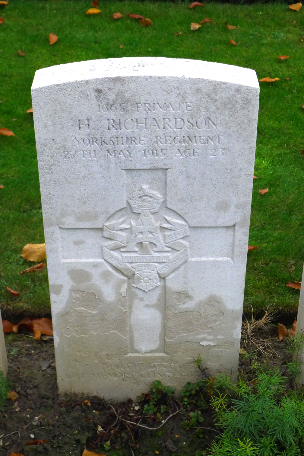 4th Battalion Yorkshire Regiment. Son of Ralph Richardson; husband of Eva Richardson, of 6, Redcar Rd., Dunsdale, Guisborough, Yorks. Killed 27 May 1915. Aged 23. Born Guisborough, Enlisted Guisborough. "DEATH DIVIDES