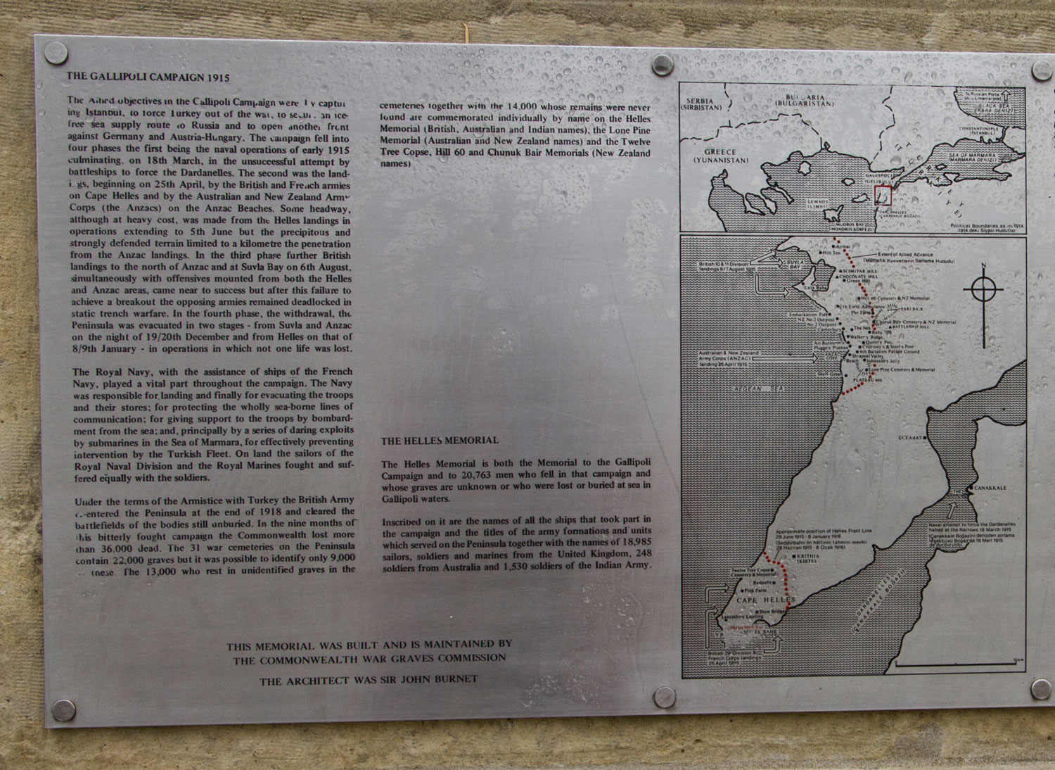 The United Kingdom and Indian forces named on the memorial died in operations throughout the peninsula, the Australians at Helles. There are also panels for those who died or were buried at sea in Gallipoli waters. The memorial bears more than 21,000 names.