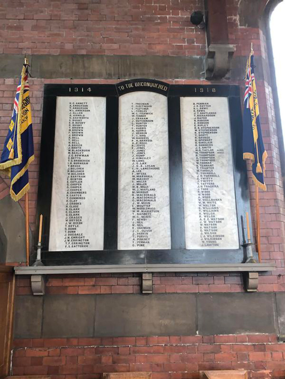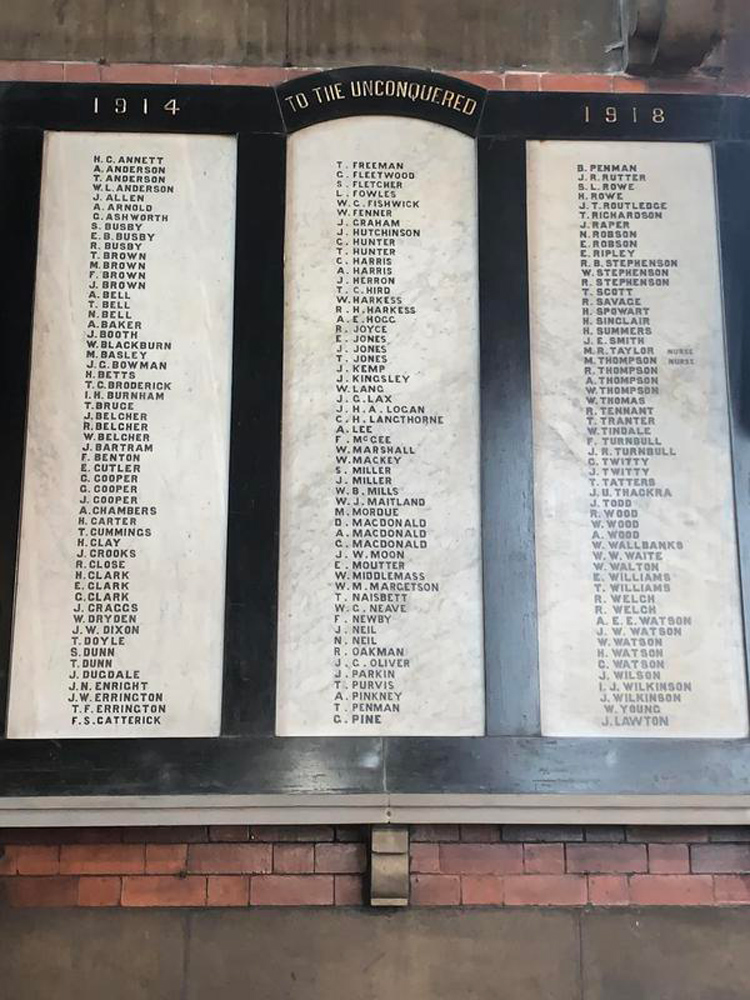 The First World War Memorial in St. Mary's Church, Horden, consists of three white marble panels in a black marble frame. The centre top has a slightly rounded edge which bears the words" To the unconquered" with the dates on either side, the lettering is carved and gilded. The names are listed in a single column on each panel in black sans serifs capitals.